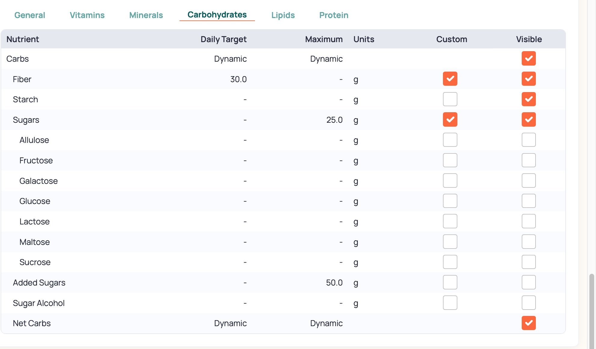 In an old post, it showed that sugar is a subcategory under carbs in my diary, but the only items I see in my Net Carbs section is what I've consumed and what is remaining. I did go into Settings and make sure Sugars were enabled and I also set up a max # of grams. Thanks for your help