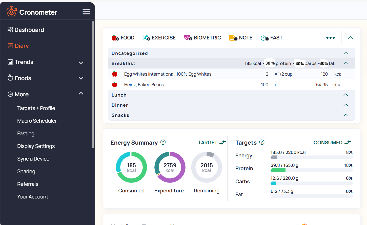 Is there a way to display macros in percentages for every meal? I need to know what percent of the calories in each meal is from carbs, what percent is from fat, what percent is from protein. Image 1 shows what Chronometer actually displays and image 2 is what I need. I want to keep each meal and snack in the percentages of 40% calories from carbs, 30% from protein, 30% from fat.