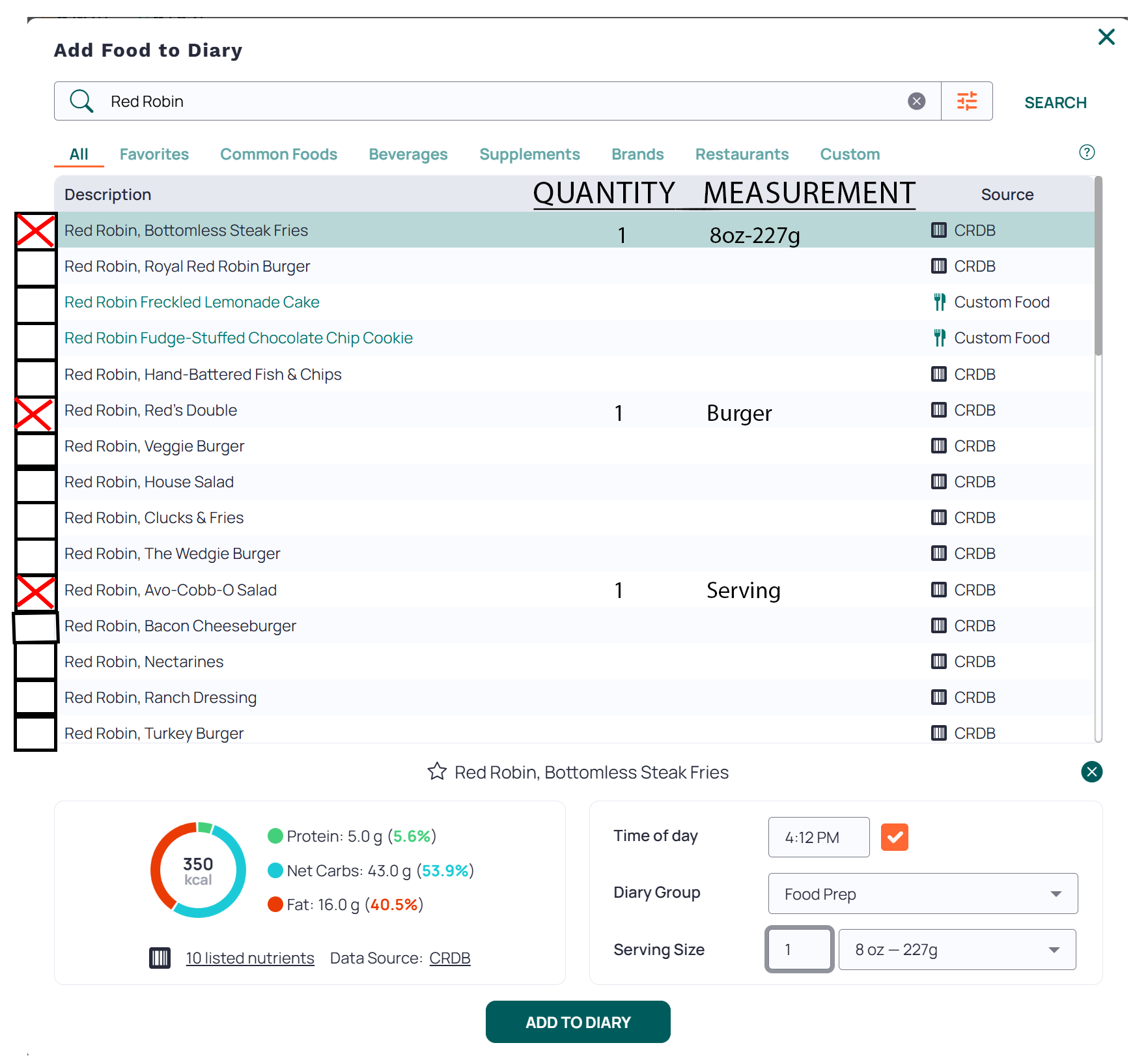 I would love to be able to multi add food by selecting multiple checkboxes next to food, or long-pressing multiple food items, so that I can bulk add multiple foods at once.